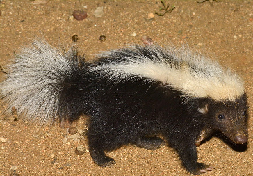 Активен по ночам и ведет одиночный образ жизни. Животное занимает участок 7-16 га. Днем скунс спит в скалистой пещерке или норе.